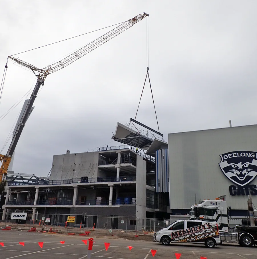 Waypoint are proud to announce another significant milestone in the Simonds Stadium $91 million redevelopment with the installation of the first roof bay on the new Charles Brownlow Stand. The roof bay, which is one of 13, was lifted by a 450 tonne crane. The occasion was captured by fans and passers by on smartphone, quickly becoming a hit on social media.